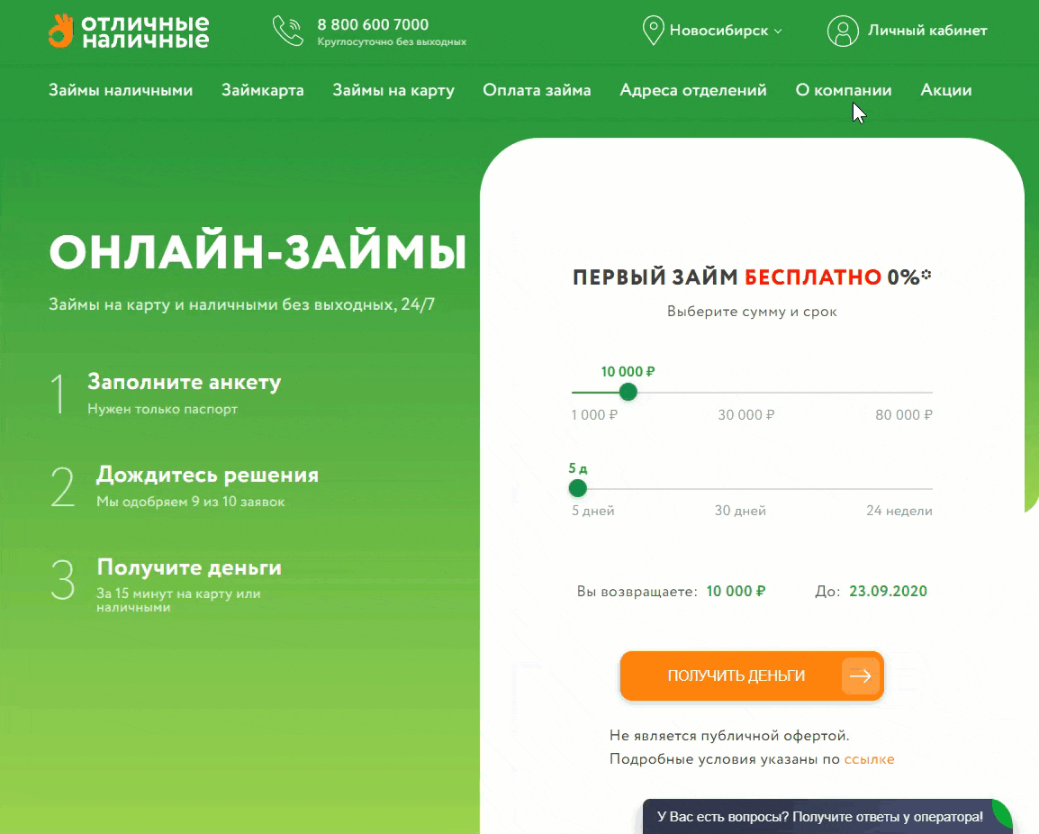 Зарегистрированным клиентам, у которых есть Личный кабинет, доступны все возможности сервиса «Отличные наличные»: