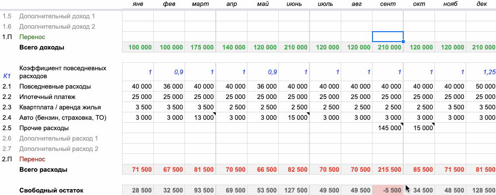 Если ваши расходы в конкретный месяц превысили доходы, то в строке «Свободный остаток» появится отрицательное значение, выделенное красным цветом.